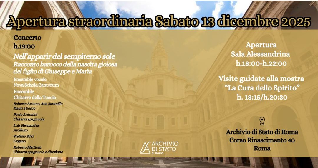 h. 19 – In sala Alessandrina sarà possibile assistere a un concerto di musica barocca dal titolo “Nell’apparir del sempiterno Sole. Racconto barocco della nascita gioiosa del figlio di Giuseppe e Maria“, eseguito dall’Ensemble vocale Nova Schola Cantorum e dall’Ensamble Chitarre della Tuscia. Il programma include musiche di autori barocchi di ambito romano da Frescobaldi a Massenzio fino a Kapsberger per spostarsi verso il Nuovo Mondo con canti natalizi e inni cristiani basati sul ritmo di danze e musiche tradizionali.