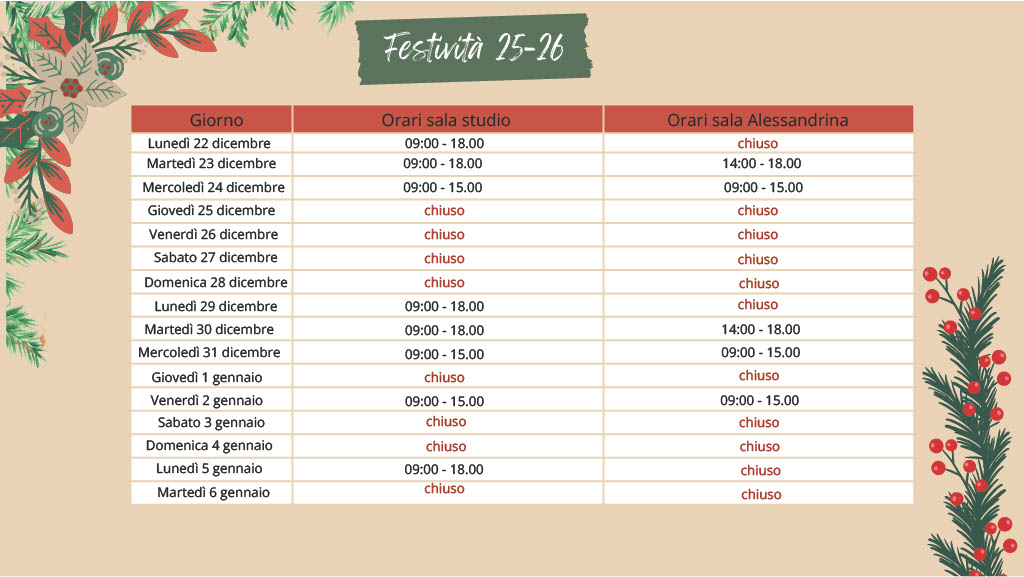 • Orari della Sala studio e Sala Alessandrina per il periodo festivo – dicembre 2025 e gennaio 2026