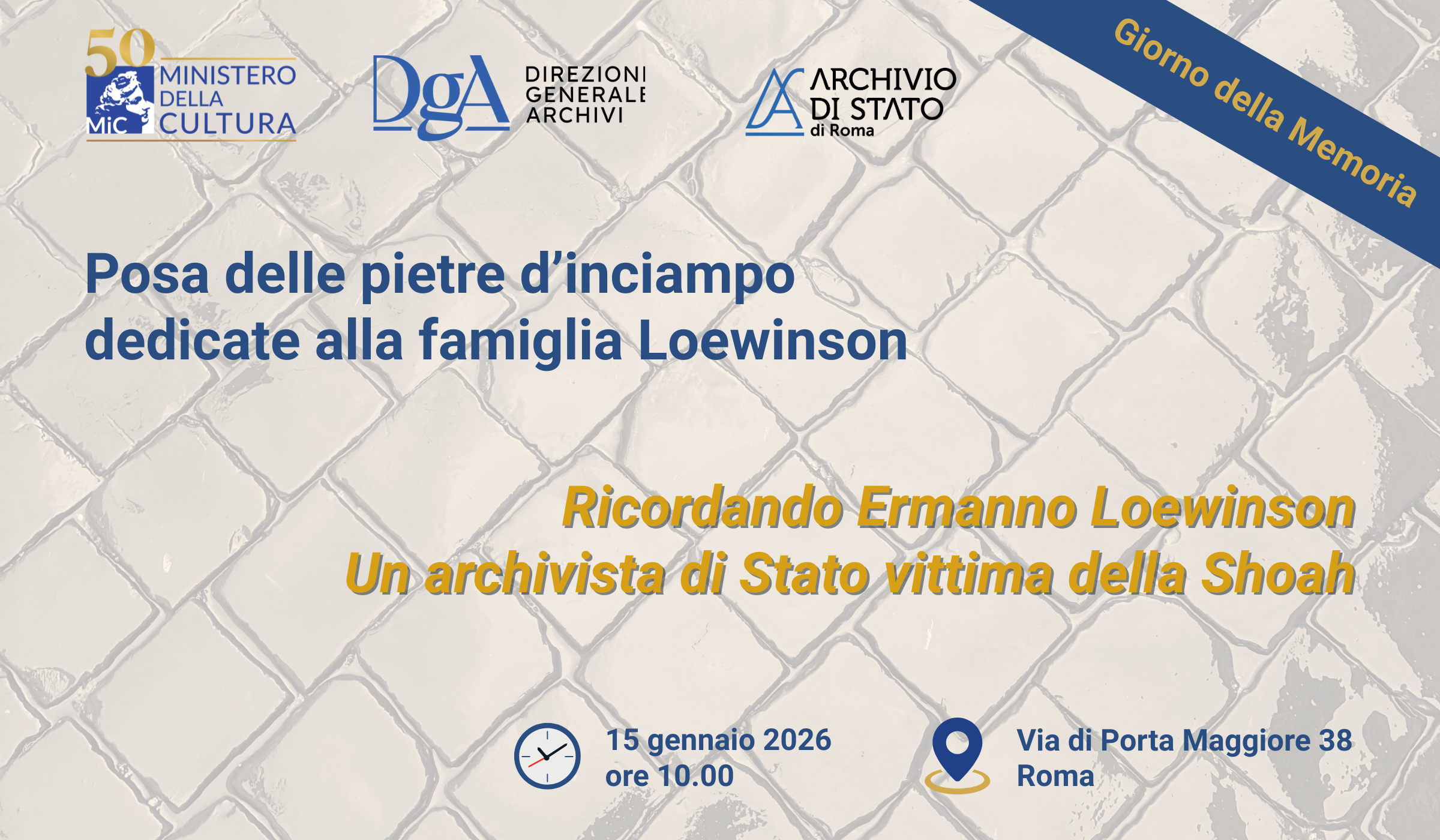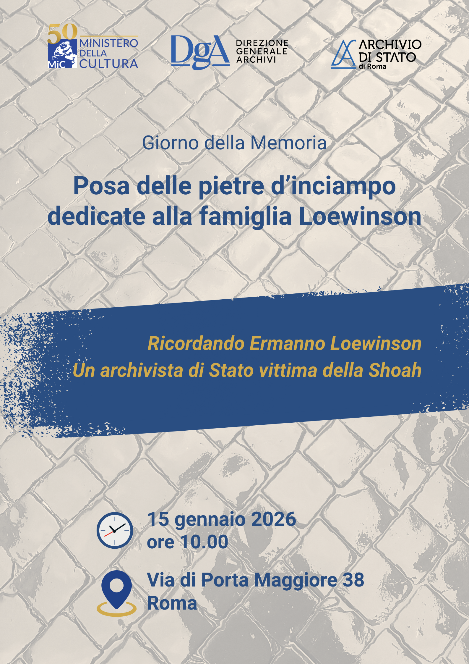 Il 15 gennaio 2026, alle ore 10.00, in Via di Porta Maggiore 38, in occasione della Giornata della Memoria, l’Archivio di Stato di Roma ricorda le figure di Ermanno Loewinson, di sua moglie e di suo figlio con la posa di tre pietre d’inciampo poste davanti all’abitazione della famiglia in Via di Porta Maggiore 38.